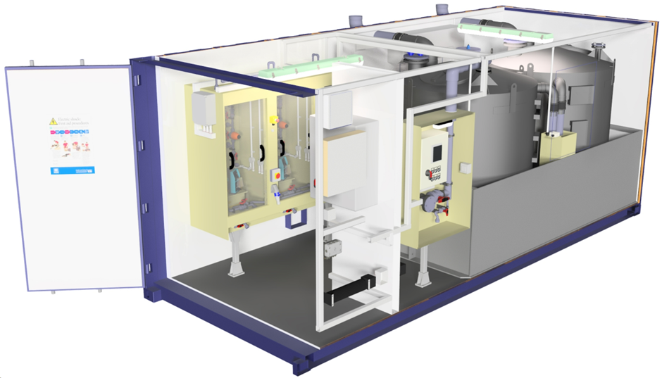 The AquaDose 5K2 – Sodium Hypochlorite is supplied with 2 off 2,500L bulk storage tanks, the tanks are located within a 110% HDPE bund all within the container footprint. The storage tank overflows are supplied with level monitored fume traps and the container is supplied with a ventilation fan to ensure the atmosphere is cleared regularly. The container is insulated and provided with Air Conditioning to maintain a consistent cool operating temperature for the chemical storage & dosing, the area temperature is monitored and alarms if high. The walls are plastic lined, allowing the area to be easily cleaned and washed down as required. The system is designed to be “plug and play” with the option for repair & routine maintenance to be covered under the Aquazone Hire Agreement.