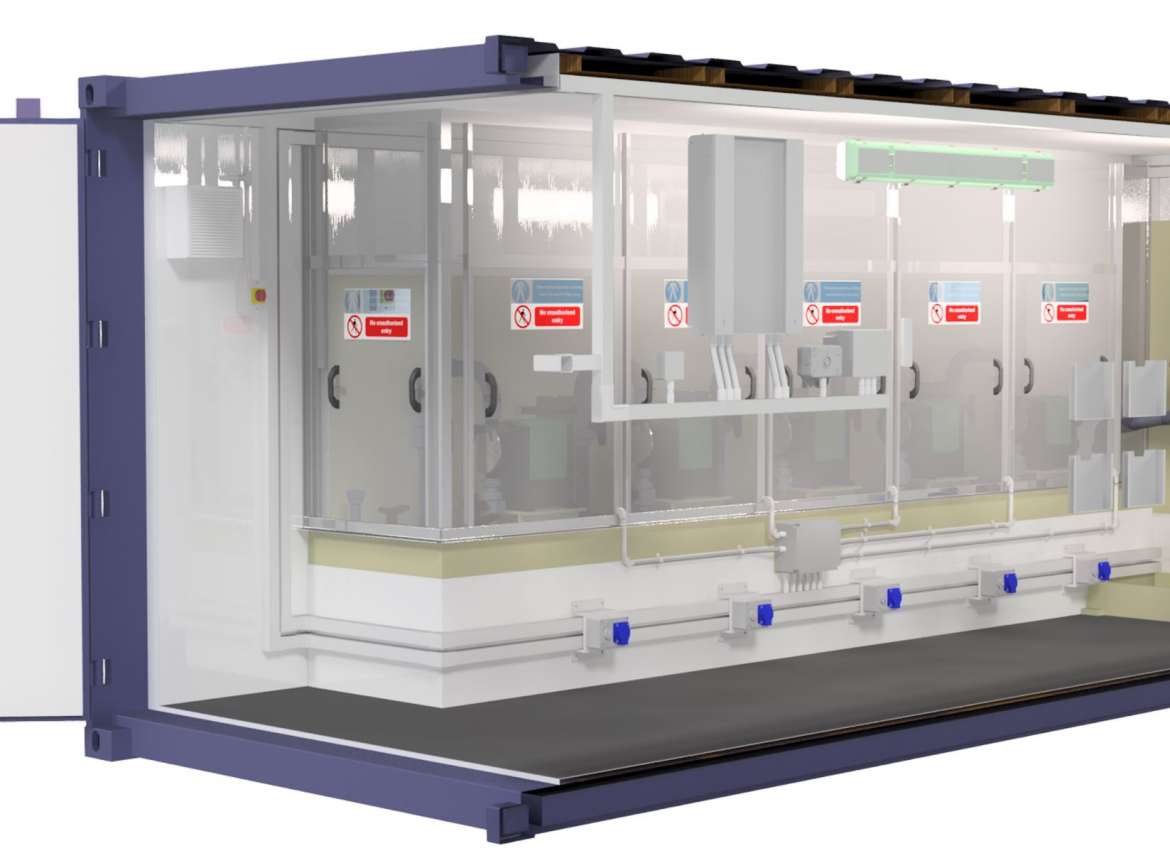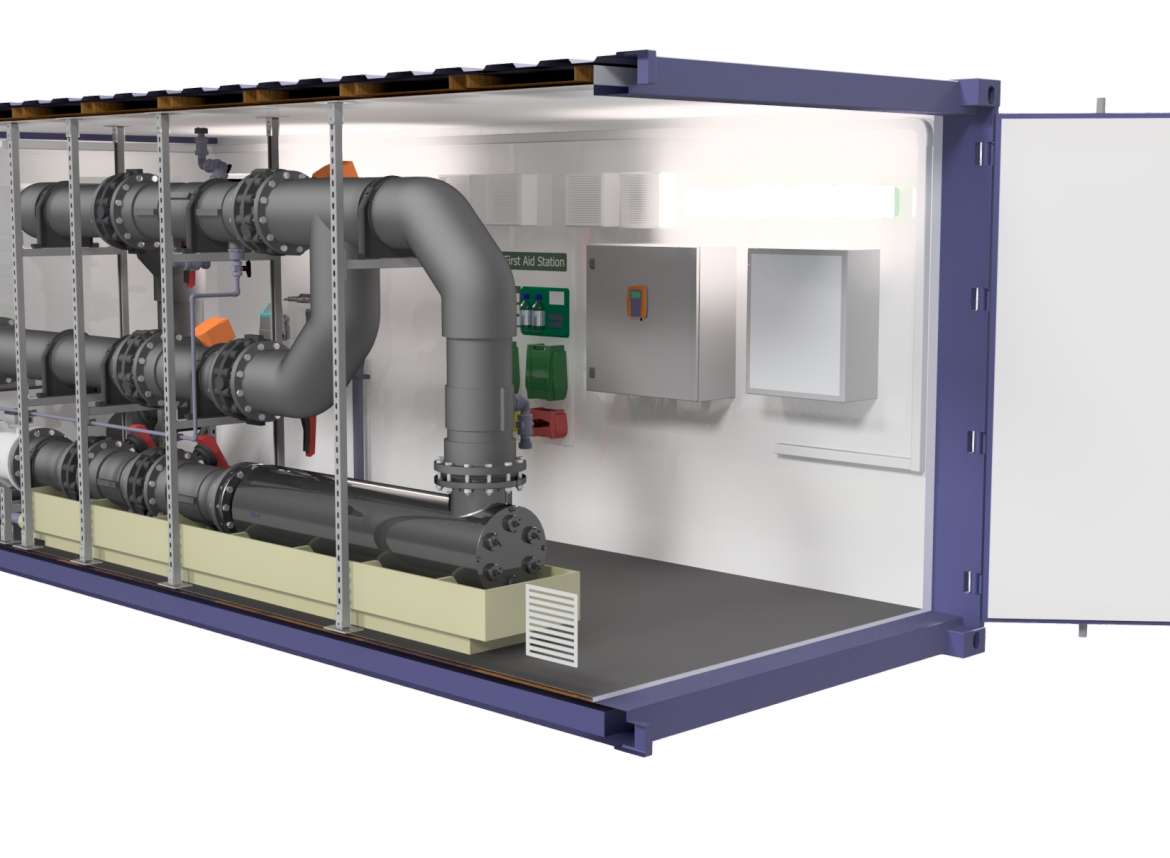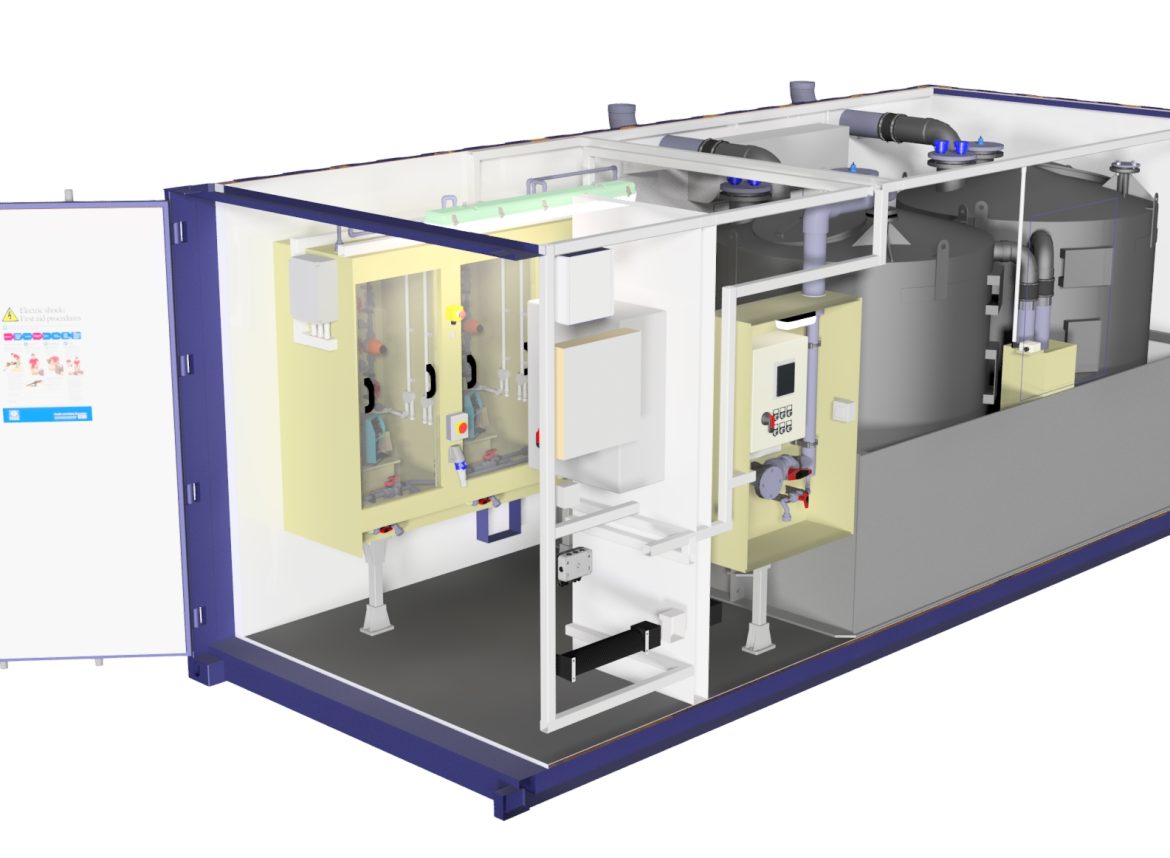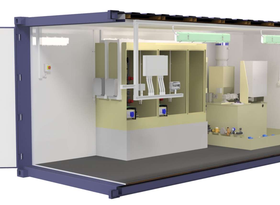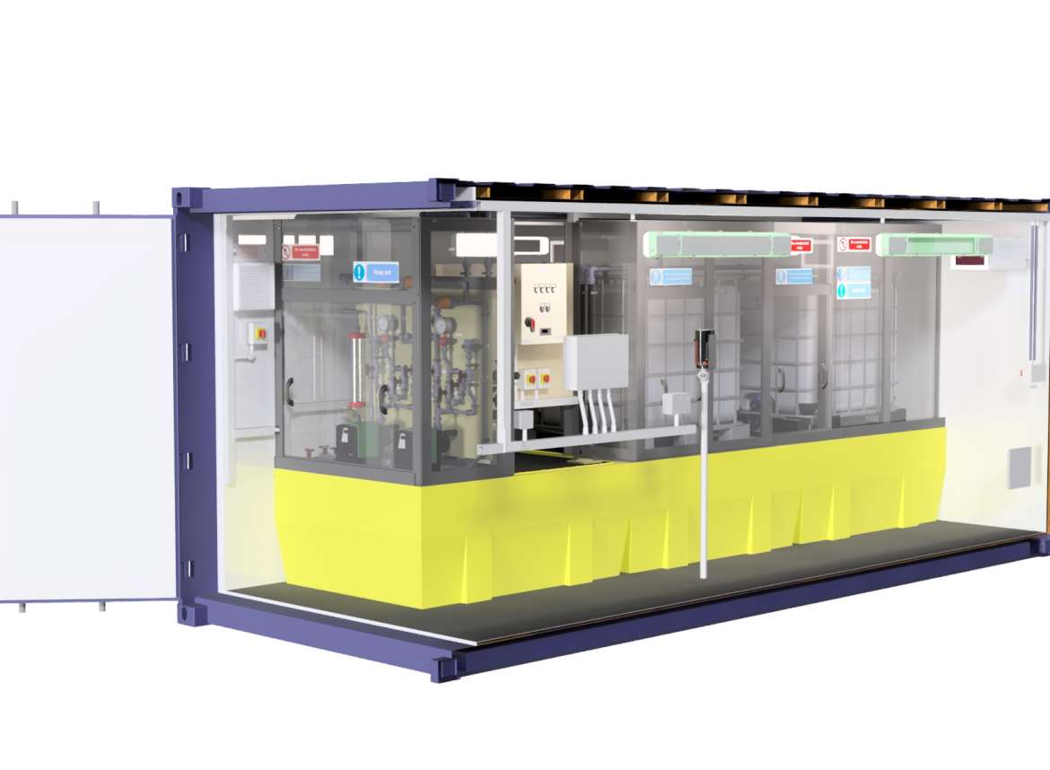 The AquaDose 5K2 – Sodium Bisulphite is supplied with 2 off 2,500L bulk storage tanks, the tanks are located within a 110% HDPE bund all within the container footprint. The storage tank overflows are supplied with level monitored fume traps and the container is supplied with ventilation fans along with a forced extraction fan to ensure the atmosphere is cleared regularly. A traffic light entry system is fitted to enable the clearing of the atmosphere prior to entry. The container is insulated and provided with ambient tubular fin heaters to maintain a high ambient temperature for chemical performance. The container…